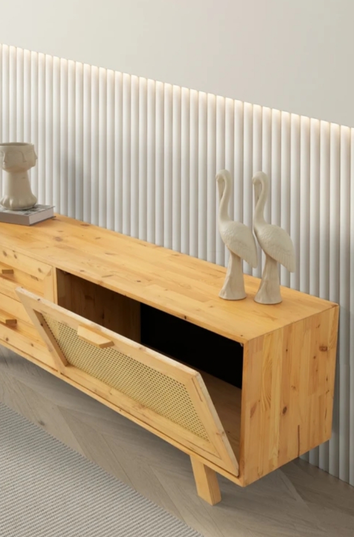 Evinizin atmosferine sıcaklık ve doğallık katacak Doğal Ağaç Hasırlı TV Ünitesi, el işçiliğiyle üretilmiş zarif detaylarıyla modern ve rustik tarzı mükemmel bir uyumla birleştirir.