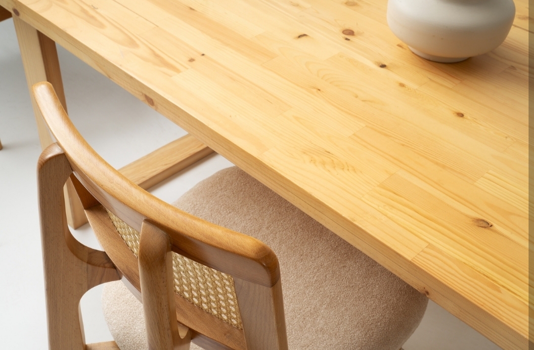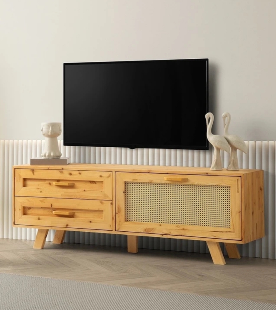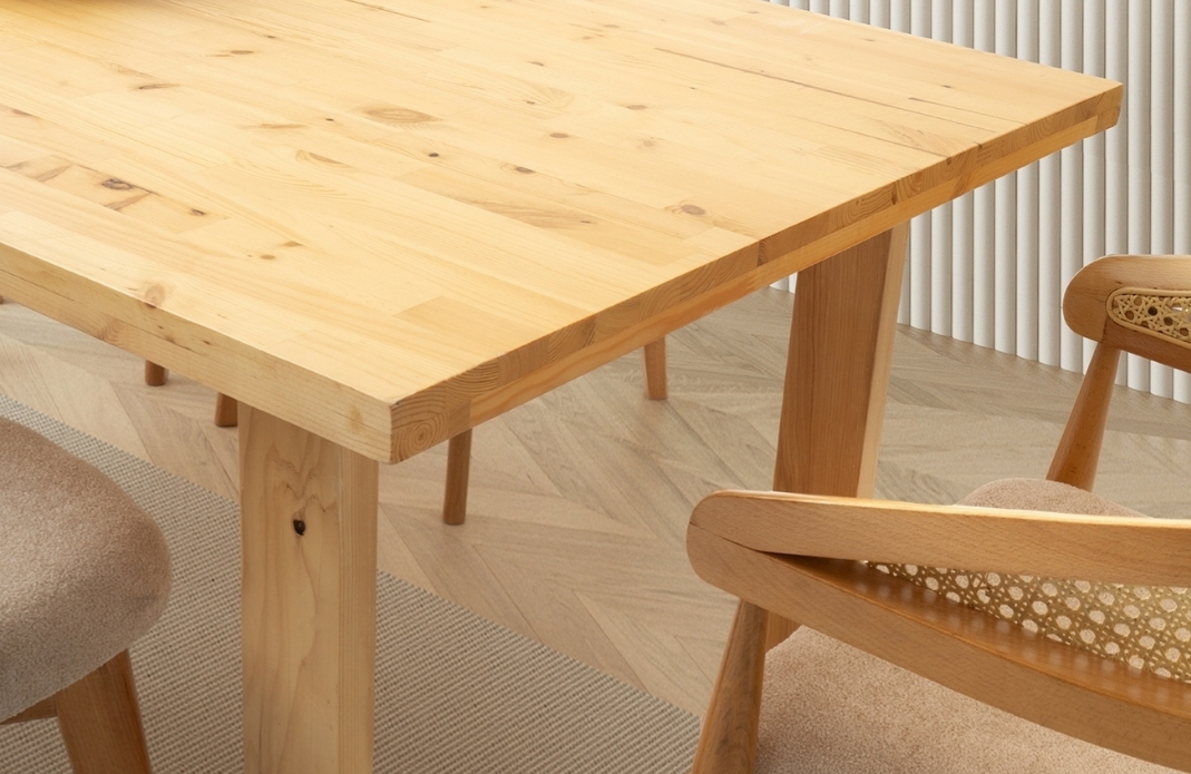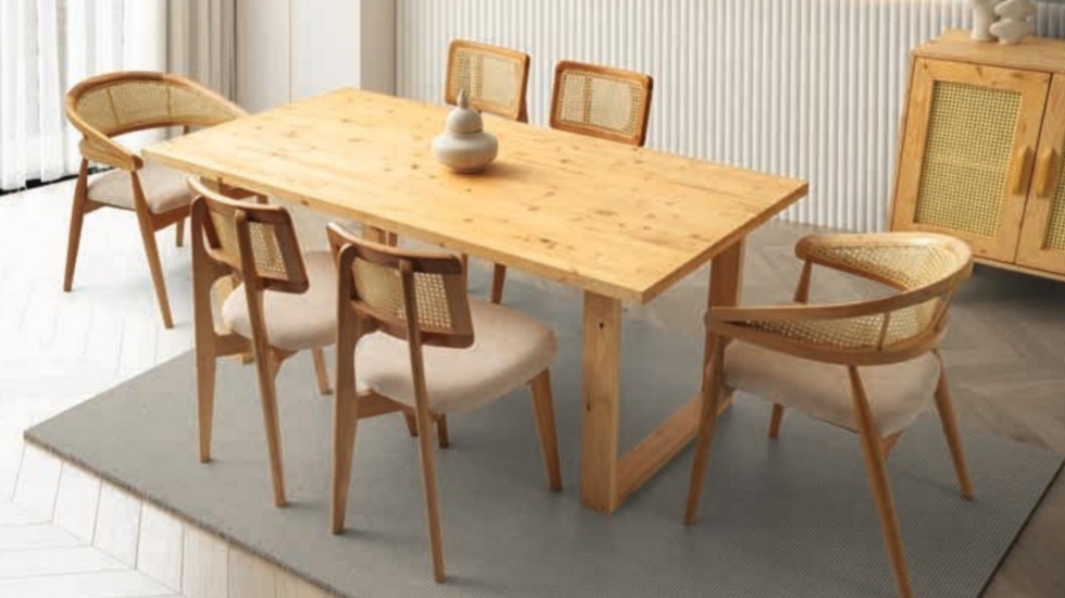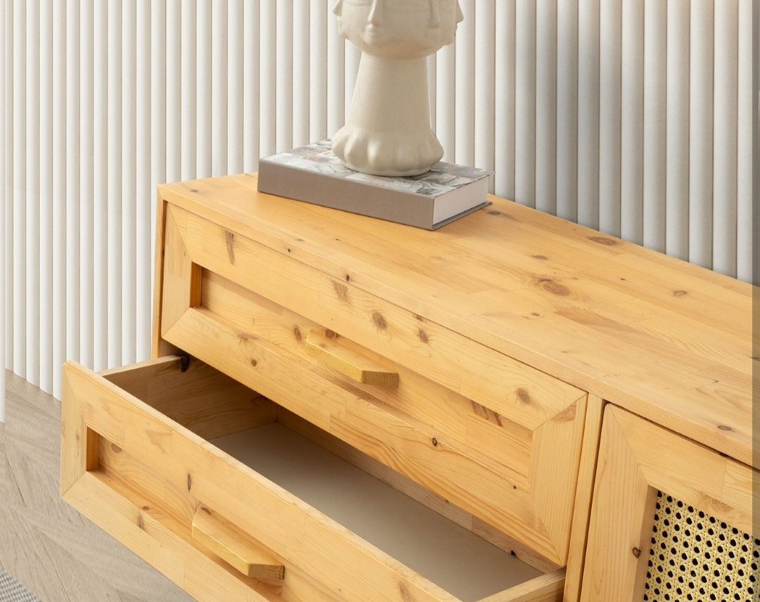 Dayanıklı natural gürgen ahşap iskeleti, uzun ömürlü kullanım sunarken; doğal hasır detaylı sandalyeler oturma konforunu ve estetik görünümü mükemmel şekilde tamamlar. Geniş depolama alanına sahip konsol ve TV ünitesi, şıklığın yanı sıra pratik kullanım sağlar.