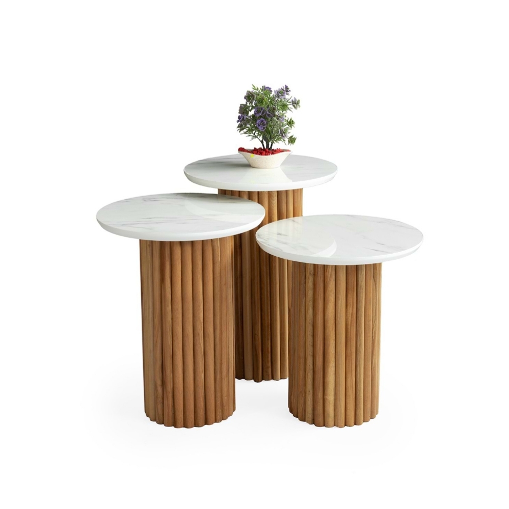 Farklı boyutlardaki üç sehpa, birbirinin içine geçebilen yapısıyla yer tasarrufu sağlar ve ihtiyaç duyduğunuzda kolayca ayrılarak kullanılabilir. Dayanıklı metal PTT ayaklar ve şık MDF üst tabla, uzun ömürlü kullanım ve sağlamlık garantisi verir.